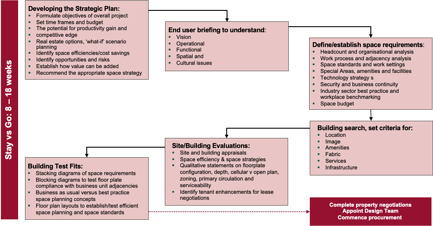 In developing the ‘strategic plan’ we look for the potential for productivity gain and competitive edge. We understand the need to attract and retain talent. We seek to identify space efficiencies through better utilisation and optimisation, and establish how value can be added. We identify opportunities and risks with mitigating options so that the organisation can make an informed decision.
